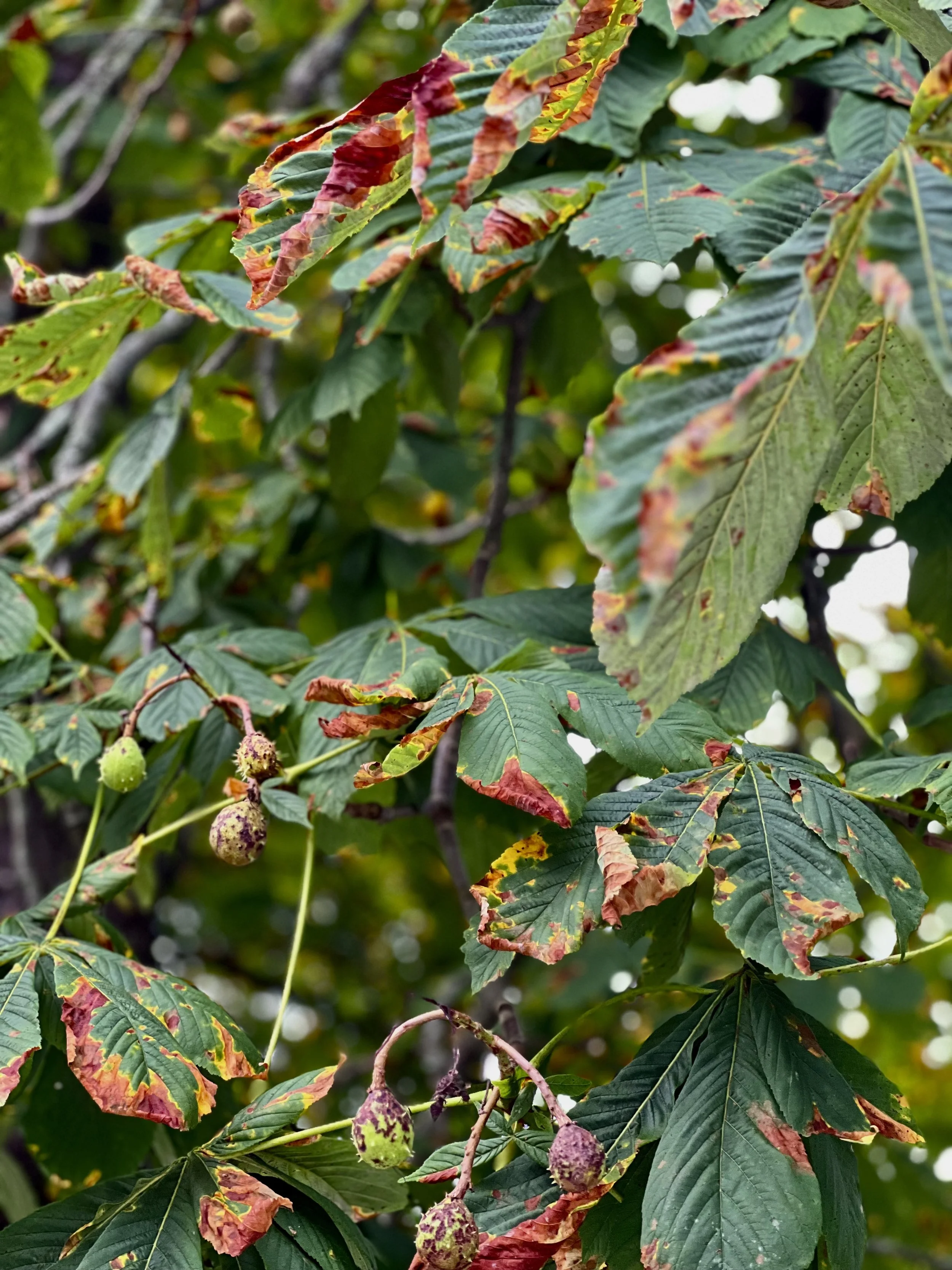 I know right where they live-those tall bandits that try to steal the last bit of summer and point their tired leafy branches towards fall. I don’t think they mean to rob us of summer, they just like to remind us to get ready - autumn is on its way. There are experts who try to blame it on leaf miner moth infestations, fungal leaf diseases, and drought stress but every year I see the same thing- those horse chestnut leaves browning, bowing out of summer’s glory days and pointing us to the change of seasons.